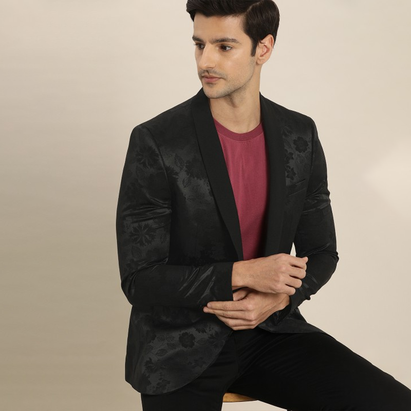 Men Black Floral Patterned Single-Breasted Slim Fit Tuxedo