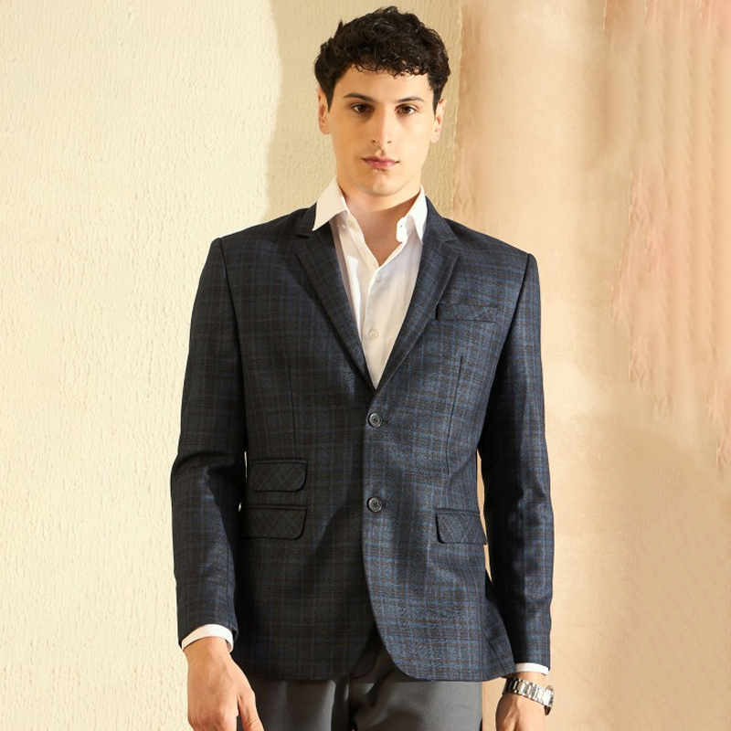 Men Navy Blue Solid Single-Breasted Regular Fit Casual Blazer