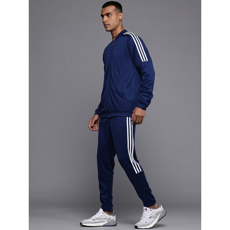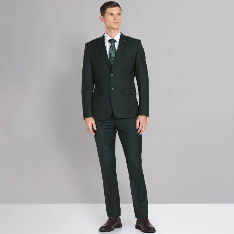 Blue self design slim-fit 3-piece formal suit Blue self design slim-fit blazer, has a notched lapel, single-breasted with button closure, long sleeves, one welt pocket, two flap pockets and double vented back hem A pair of blue self design mid-rise trousers, has a zip fly with button closure, two pockets Blue self design slim-fit waistcoat, has a V-neck, button closures on the front, sleeveless Size & Fit Slim-fit The model (height 6') is wearing a size 36 Material & Care Poly-Viscose Dry Clean