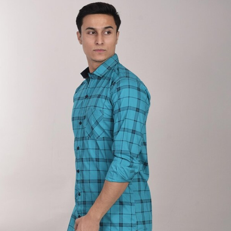 Bought First Men Light Blue Checkered Pure Cotton Formal Shirt (M)