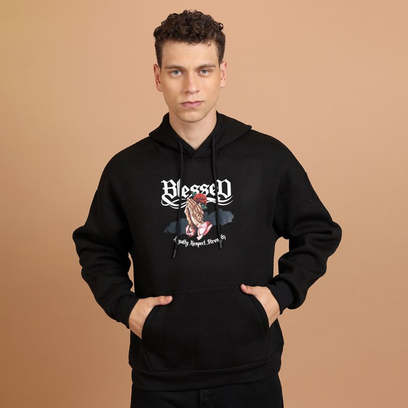 Black Graphic Printed Oversized Hood Pullover Sweatshirt