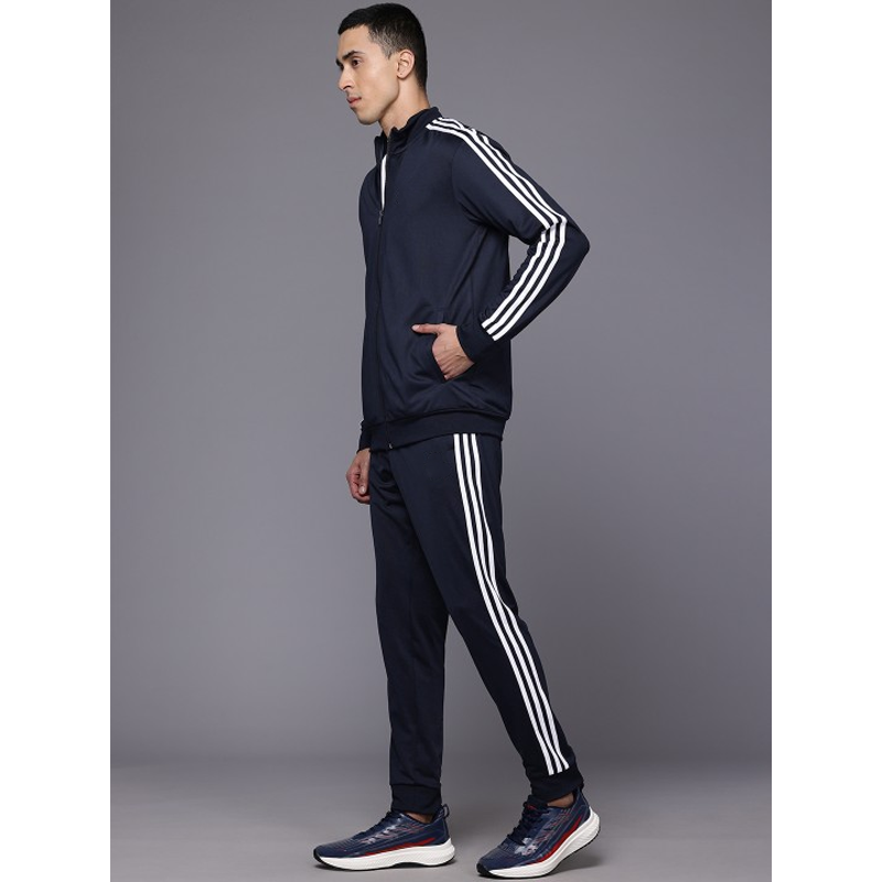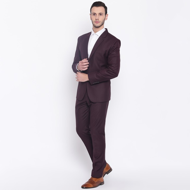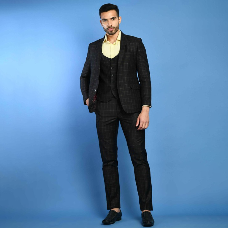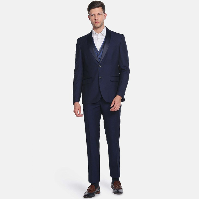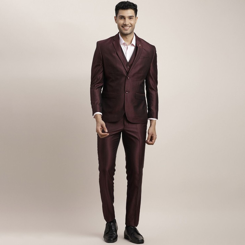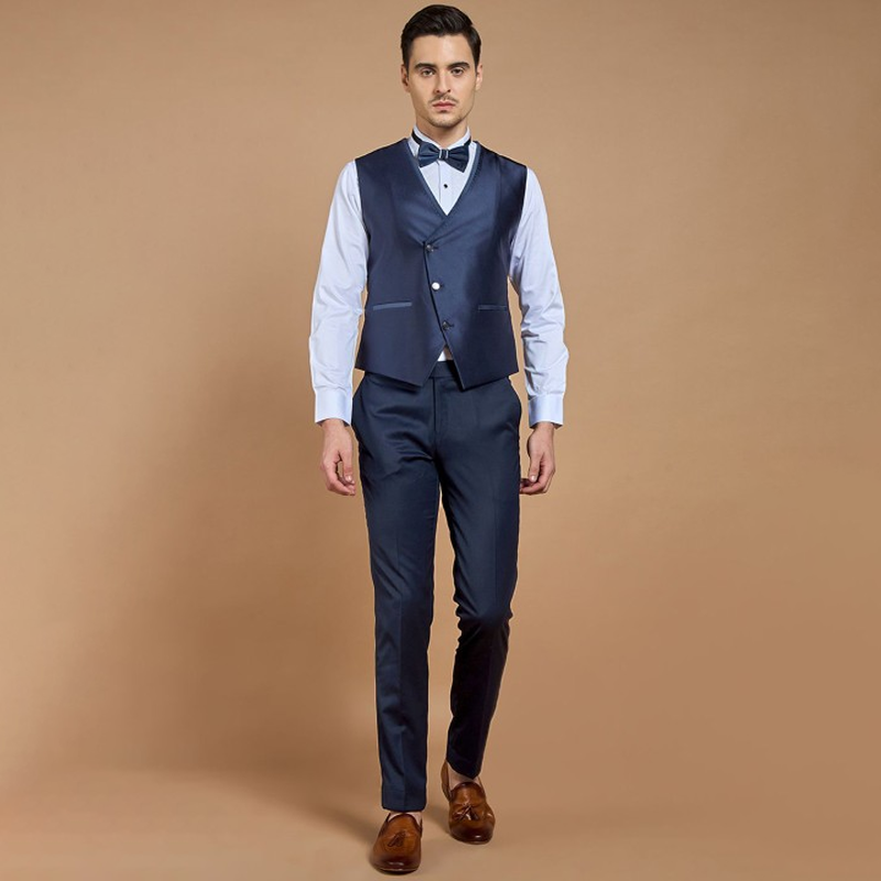 Blue self design slim-fit 3-piece formal suit Blue self design slim-fit blazer, has a notched lapel, single-breasted with button closure, long sleeves, one welt pocket, two flap pockets and double vented back hem A pair of blue self design mid-rise trousers, has a zip fly with button closure, two pockets Blue self design slim-fit waistcoat, has a V-neck, button closures on the front, sleeveless Size & Fit Slim-fit The model (height 6') is wearing a size 36 Material & Care Poly-Viscose Dry Clean